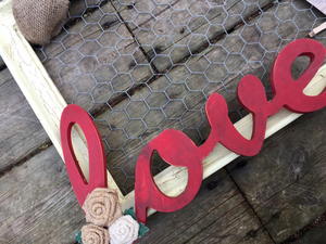 - Face the frame front again, Glue the word love in place. Embellish as desired with burlap flowers. Run a loop of Burlap Ribbon through the top of the frame and chicken wire on both sides and tie in a bow. Trim ends if desired with scissors.